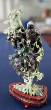 A modern carved group, a pair of exotic birds on a branch with a carved wood base, overall height 36cm.