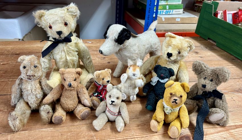 Collection of teddy bears and other animals. 11 in total to include 24cm Steiff bear, 12 cm Steiff squirrel (button missing)1930's 20cm Farnell fox terrier along with various assorted small bears.