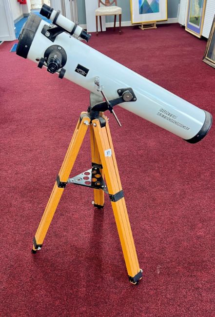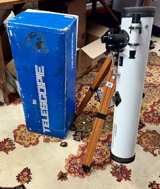 A boxed Telescope on wooden stand, with achromatic coated lens.