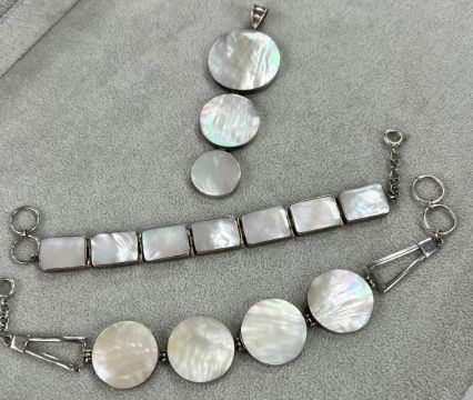 Two modern silver mother of pearl bracelets and matching pendant (3).