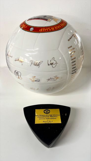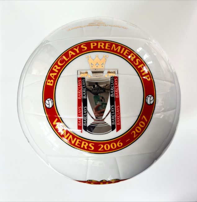 A Manchester United Champions porcelain football Trophy, official merchandise, Barclays partnership, winners 2006-2007, with plaque stand, boxed.