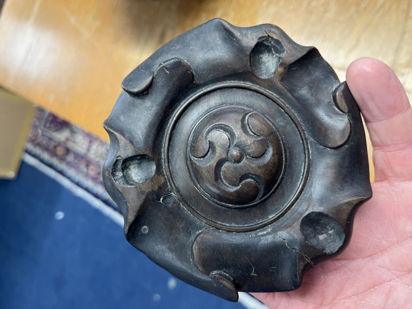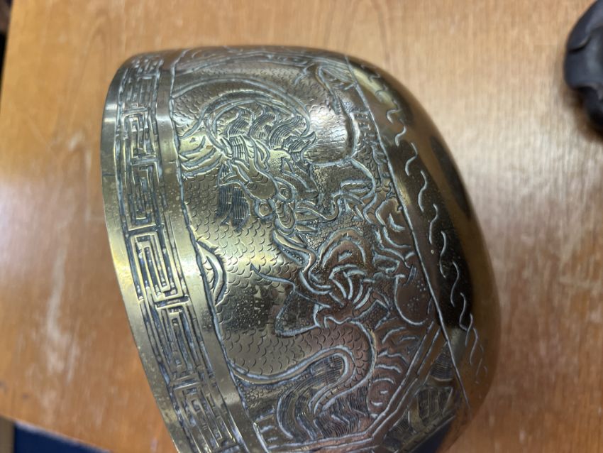 A Chinese carved wood stand, diameter 10cm, a circular lacquered and gilt bowl signed Taimi & Co 30cm and a heavy brass Chinese decorated bowl with character mark to base, diameter 25cm (3)