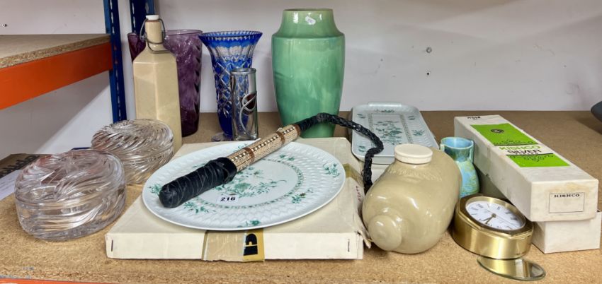 A Bernardaurd Limoges porcelain circular cake and sandwich plate, also silver plated cake slivers, heavy glass powder boxes, art blue glass vase, various porcelain, Swiza clock and other items.