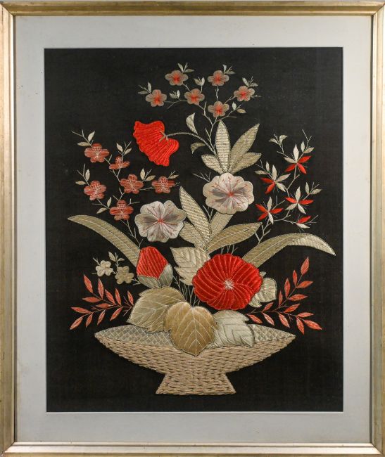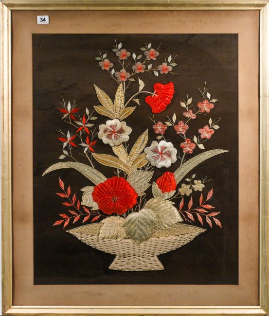 A pair of embroidered pictures of flowers arranged in jardinieres (mounted, framed and glazed) 85.8 by 72.4cm; (2)