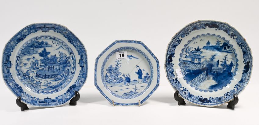 Three blue and white plates, 18th and 19th century Each of octagonal form, two painted with pavilions in a lake landscape, the other with two figures amongst trees, 19cm to 23.5cm.