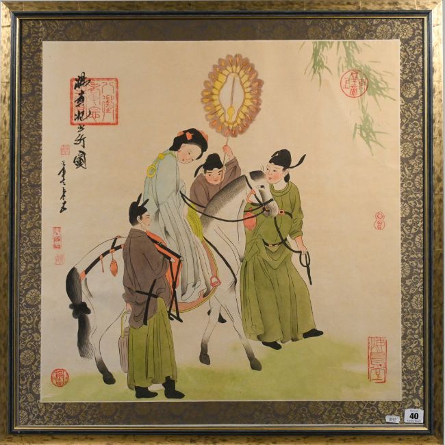 Equestrian scene, ink and colour on paper, signed, collector’s seals (framed and glazed). 73 by 72.50cm