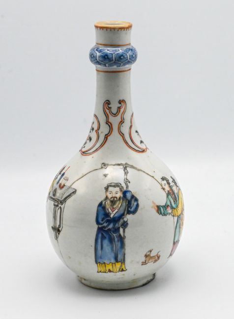 A ‘famille-rose’ bottle vase, late 18th century, the globular body rising from a short foot to a slender tapering neck with a raised band below the mouth and painted with figures and boys in an interior (damaged)