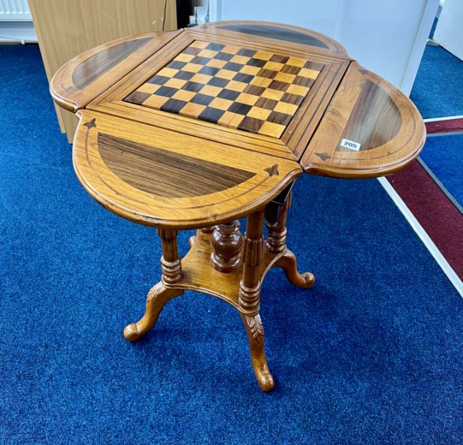 Continental mahogany and inlaid games table with four drop flaps, removable games board with glass chess set.