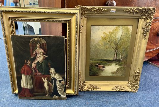 A religious subject oil on canvas painting in gilt frame together with F. Dingle oil on board 'Cattle by a River' in gilt frame, overall size 50cm x 40cm