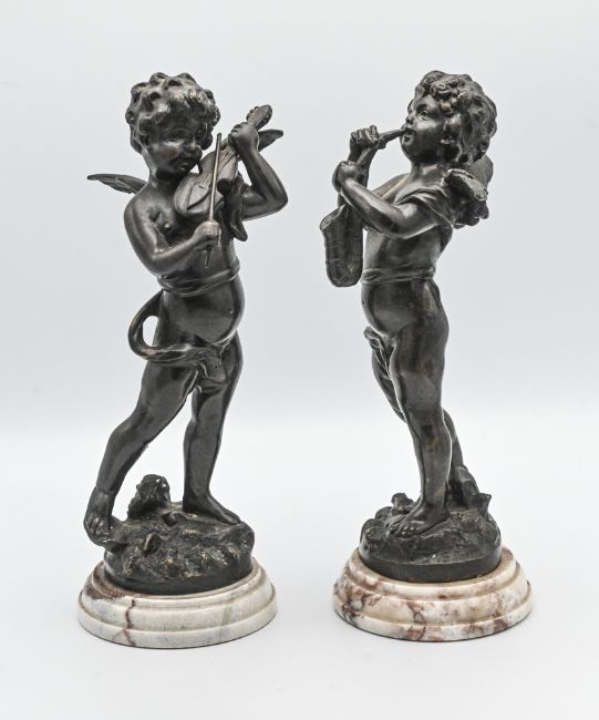 A pair of bronze winged cherubs musicians on marble base, height 34cm