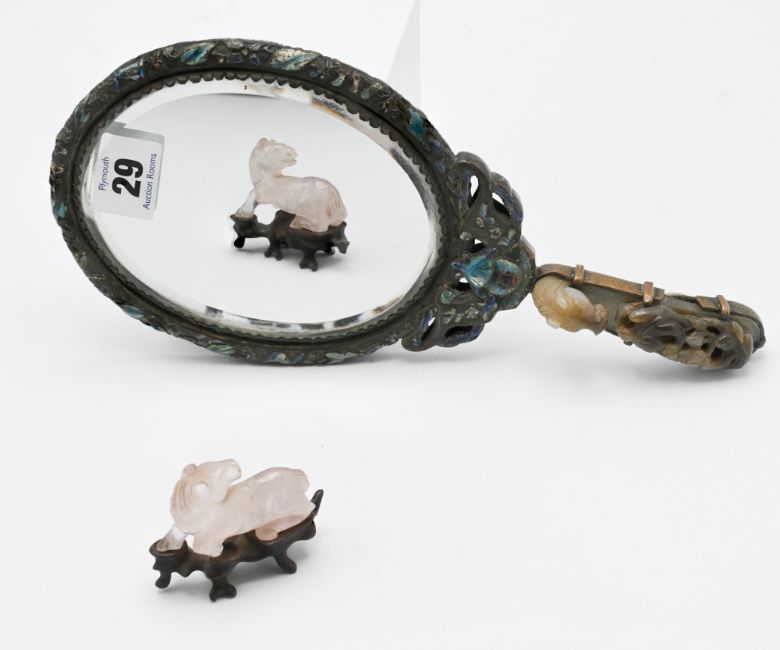 A carved jade belt hook, Qing dynasty, carved in the form of a horse’s head facing bats on a fruiting vine, the stone with celadon and dark inclusions, mounted on a carved wood hand mirror; together with a rock crystal carving of a horse lying recumbent with its head turned over its back (fitted wood stand).