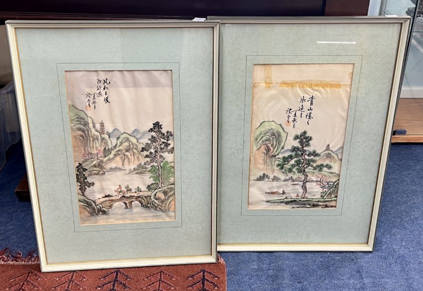 A collection of Chinese paintings comprising; six paintings on silk, exotic birds and flowers (framed and glazed) Oil on Canvas, boating scene, signed (framed) Photograph of Hong Kong harbour (framed and glazed)
