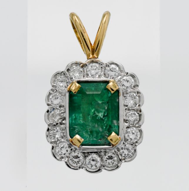 An 18ct emerald and diamond pendant, measuring approx. 16 x 13mm.