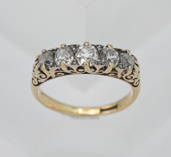 An 18ct diamond set five stone ring, size N.
