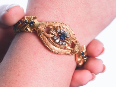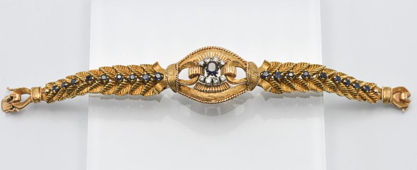 An impressive 18ct yellow gold sapphire and diamond feathered construction design cuff bracelet decorated with feathers, with a cartouche sapphire and diamond cluster to the centre, tongue and hook clasp, sapphire set in a line, believed to be circa 1950's by Garrard & Co, London, total weight 60.7g possibly original box by Garrard & Co, London.