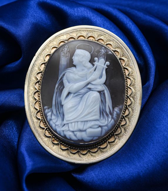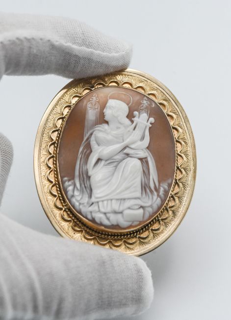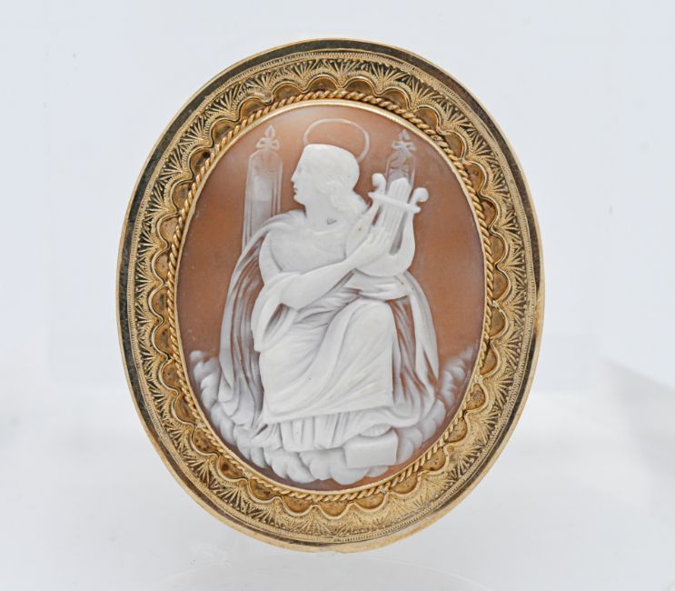 An antique gold cameo brooch, measuring 67mm x 55mm.