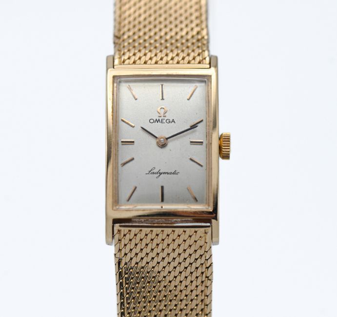 Omega, a 1960's 18ct yellow gold 'Ladymatic' rectangular case, with integral bracelet, silver baton dial, 136 751 803. approx. 53.9g, with guarantee dated 24/1/67.