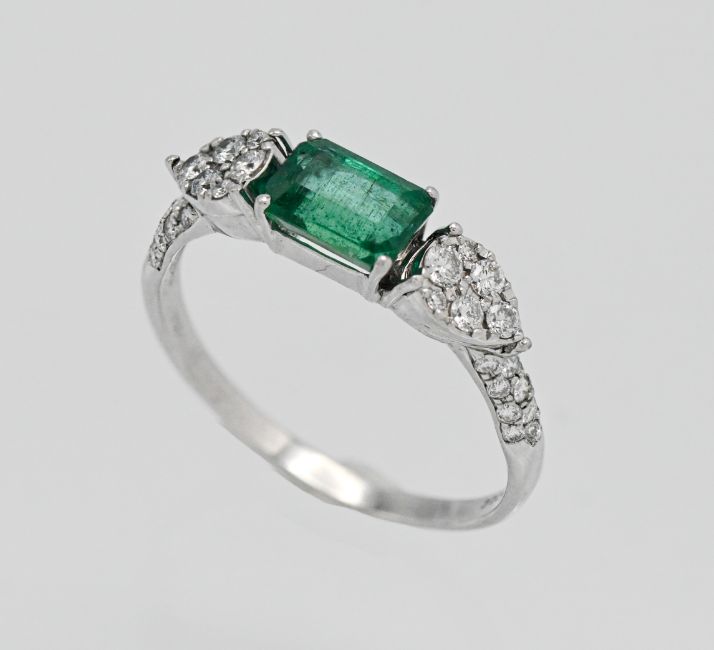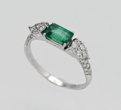 An 18ct white gold emerald and diamond ring. Size P.