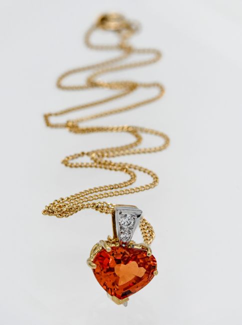 An 18ct gold single stone heart shape Mandarin Garnet approx. weight 6.18ct set with two small round brilliant cut diamonds to the above total diamond weight approx. 0.15ct, design reference 07-41-065/11 -20-005, with a copy of insurance valuation dated 2006, valued at £2,300 from Michael Spiers, Plymouth.
