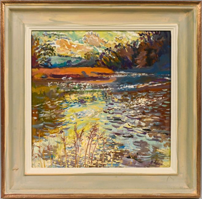 Mary Martin (Cornish b1951-) 'High Tide at Cotehele Quay - December Morning', oil on board, Exhibition Cornwall's Coasts and Moors (2007), overall size 35cm x 35cm.