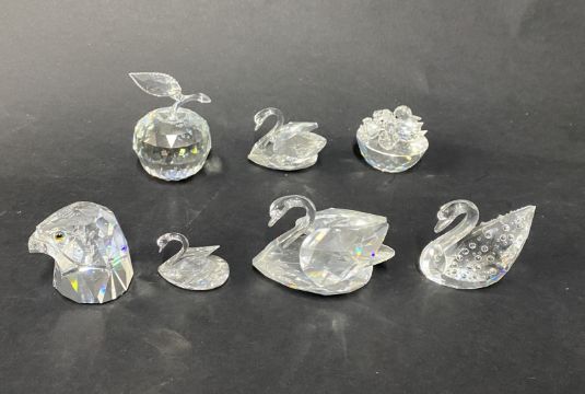 Swarovski Crystal Glass, a small collection of birds including an eagle head, four swans (one stylized), ducks on a duck pond, etc. Also including one large apple. Seven in total, unboxed.