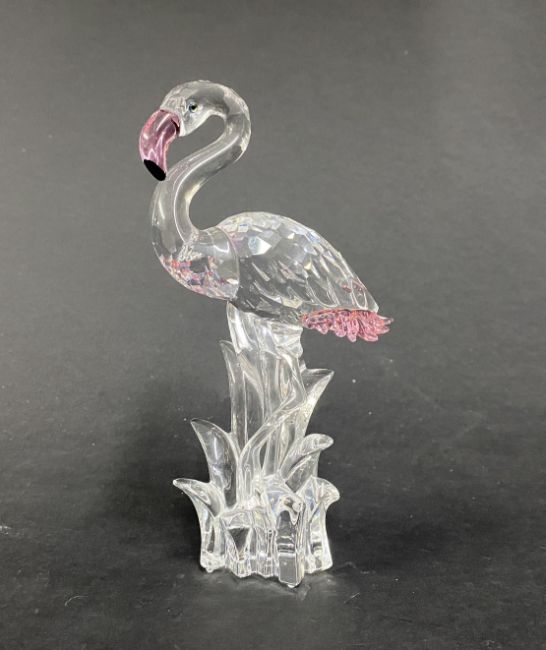 Swarovski Crystal Glass, 'Flamingo stood in grass' with green eyes, a pink beak and pink feathers, boxed.