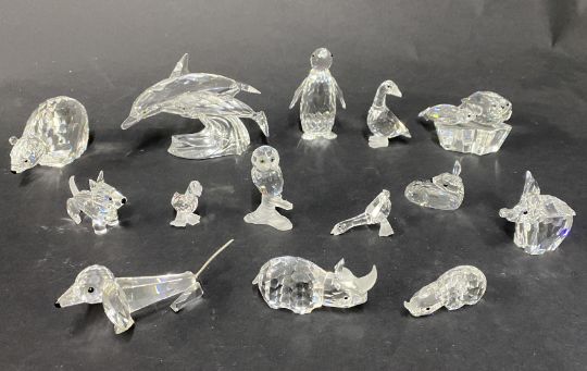Swarovski Crystal Glass, a collection of animals of various sizes, to include a 'Perched Owl', 'Seals on a rock', a penguin, and two dolphins on a wave, etc. Fourteen in total, unboxed.