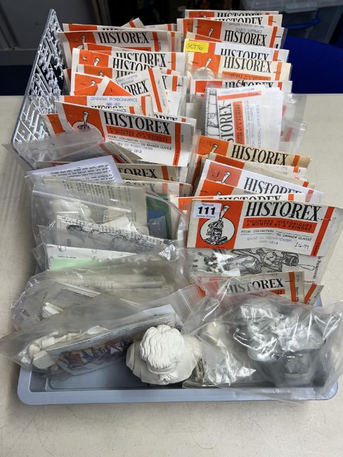 A large collection of Historex plastic bag sets, to include 'Guide De Poniatowski 1808-1813', 'Artillerie 'A Cheval 1804-1812- Garde Imperiale', 'Pochette Academies', etc. Fifty-nine bagged sets, unopened, twenty-one bags of miscellaneous components. Also including a '17cm by 10cm' bust of Mozart by A. Giammilli.