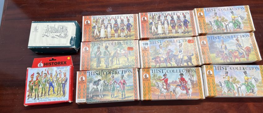 A collection of twenty two boxes of Historex figures to include five boxes of La Guande Armee-Prestige Du 1st Empire (54mm), four boxes of plastic Construction kits of Napoleonic period soldiers (54mm) and nine boxes of 1/30 scale figurines Historiques A Monter Et A Peindre from the De Grande Classe collection with an indention to 54mm 30308-Cantiniere Et Bivouac, 54mm 30305- Le Fourgon Regimentaire, 775 Ambulanc Legere A 4 Roues and 6.88-684 Pochette Conversion Officer.