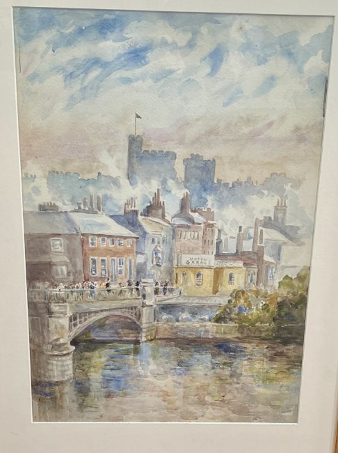 A vintage wood and copper fire place 'Blower', Victorian architectural wood cased mantel clock, the dial inscirbed Goldsmiths Company London, with eight-day movement, striking on the gong with pendulum and key, height 38cm, Alice William CBE (1950's) watercolour 'Windsor Castle from Eton, not signed but inscribed on reverse, 53cm x 53cm, framed and glazed also a George III mahogany drop flap table on pad feet, length 90cm (4).