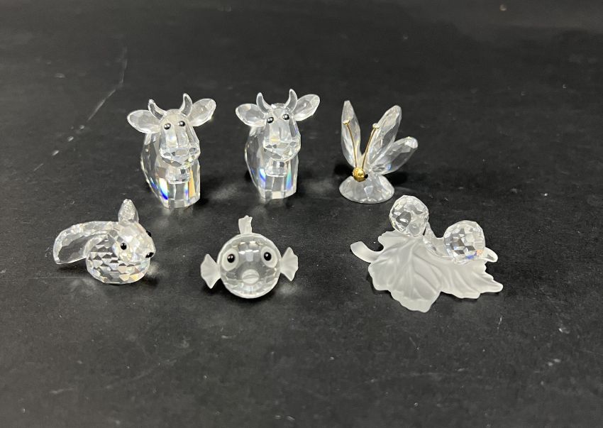 Swarovski Crystal Glass, a small collection of six pieces including two Lovlots Pioneers - Missy Moo, Butterfly, Bunny Rabbit etc, boxed.