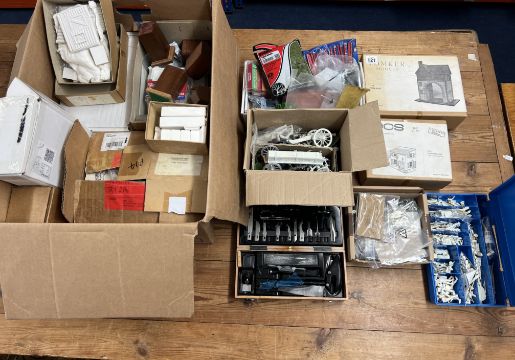 A collection of various scenery, modelling tools, military accessories, plinths, unpainted busts and a box of unpainted anatomical parts, makes by Tomker Models, Will Kits, Verlinden, etc, to include Tomker Models T.15 Town Gate and T21 Log Cabin and a Verlinden DCS 6/10 scale Farmhouse 1/35 at 54mm scale, etc.