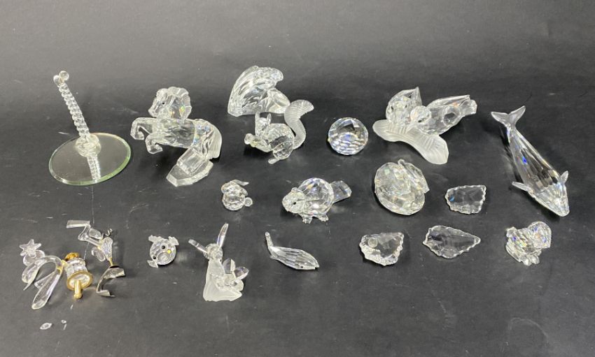 Swarovski Crystal Glass a small collection of damaged pieces and broken parts. To include sixteen larger items, unboxed, one boxed squirrel, and an undamaged 'Swarovski Collectors Society Charter Member 1987' trophy, with engraving to V.M.Willis.