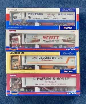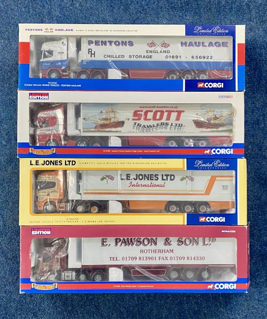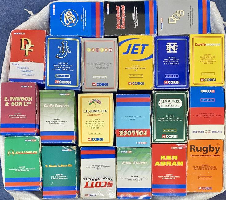 Collection of 21 Corgi model haulage trucks, boxed. Including limited editions. Scale 1:50, CS Ellis Group ltd, E Pawson & sons ltd Langdons Transport, R Swain & Sons, Eddie Stobart, T Alun Jones, Curran, LE Jones, Scott Trawlers, Eddie Stobart, Pollock,