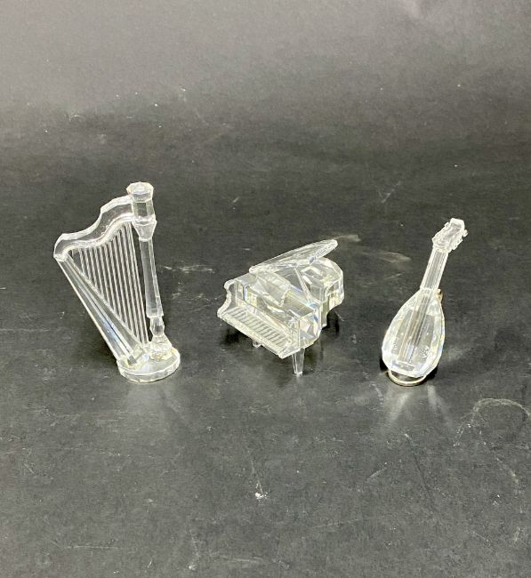 Swarovski Crystal Glass, three musical instruments, including a grand piano, a lute with stand and a harp. Three in total, not in original boxes.