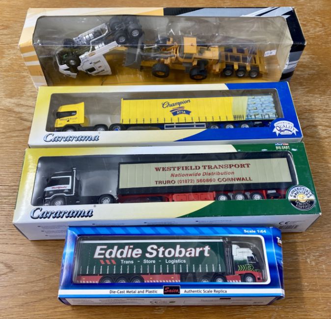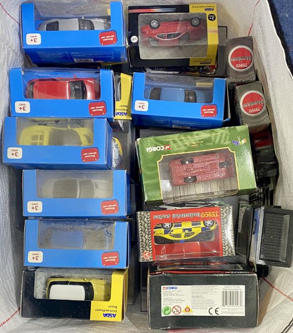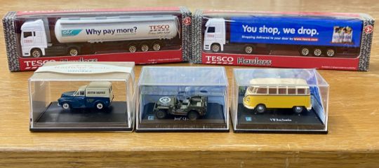 Large collection of 46 models, including cars, haulage trucks, vans etc. Boxed, cased, to include Corgi, Transit Van TY 81712, Saico, Michelin, Peugeot, Citroen, Eddie Stobart, Austin Service, VW Bus Samba, Tesco and others.