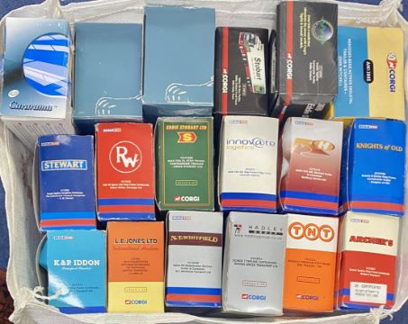 Collection of 18 model haulage trucks, boxed. Including limited editions. Scale 1:50 to include Cararama Tyneside express transport Lion-toys metalen modelauto’s , Lion-toys metalen modelauto’s , Corgi Stobart Ford Focus WRC Rally Team, Corgi Eddie Stobar