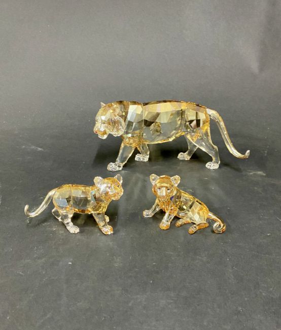 Swarovski Crystal Glass, "Endangered Wildlife Collection" - 'Tiger', boxed. 'Baby lion' in yellow glass, stood, boxed. 'Baby lion' in yellow glass, laying, unboxed. Three in total.
