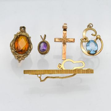 An amethyst pendant, 9ct cross pendant and other jewellery including an Italian 9 carat bar brooch