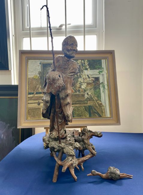 A large Chinese root carving of a fisherman, with detached bird. Height including rod 83cm