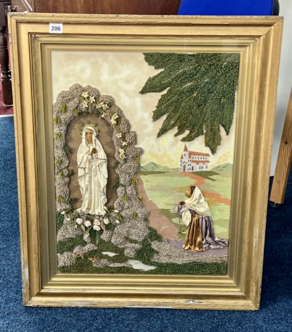 19th century needlework picture, decorated with silk work and wool work, depicting a religious scene and the landscape beyond, inscribed Je Suis Limmacuale Conception. Framed and glazed. Overall size 78 x 64.
