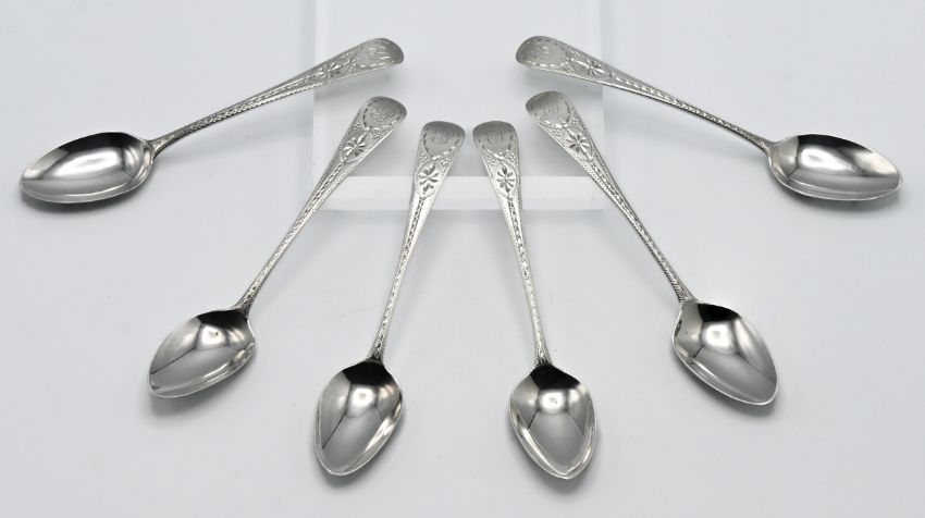 Set of six Georgian bright cut teaspoons (one spoon with date variation letter). Approx 3.15 oz