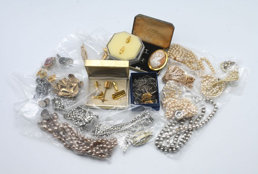 An assortment of various costume jewellery, including pearl necklaces, GP cameo, cufflinks etc