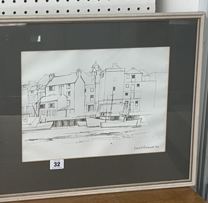 Derek Holland, Boats tied up at The Barbican, Plymouth, Pencil and ink sketch, Framed and glazed - signed Derek Holland 1973, 33cm x 25cm. Derek Holland 1927-2014, Painter, draughtsman and teacher born in Chesterfield. He became Head of the Art Dept at Plymouth College until 1973 after which he pursued a successful career in figurative, landscapes and murals.