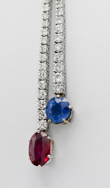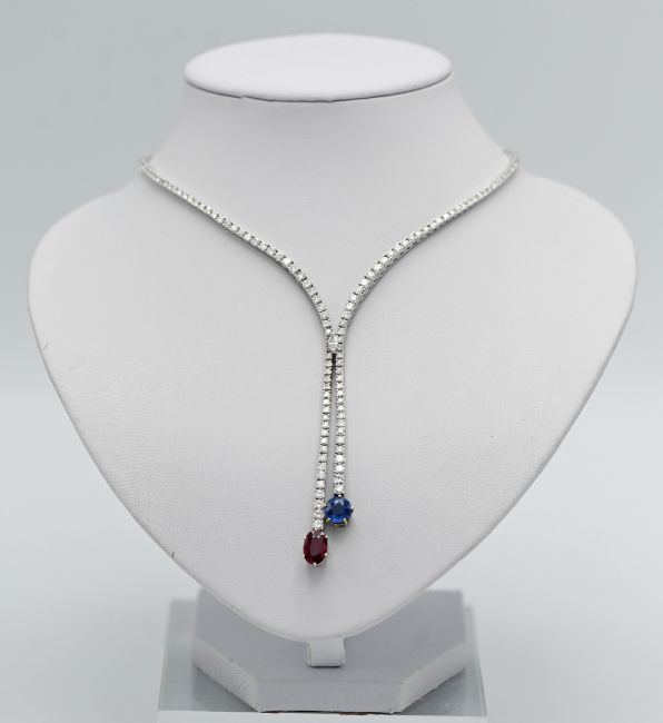 A stunning diamond line necklace set in 18ct white gold, further set with a large single ruby and sapphire.