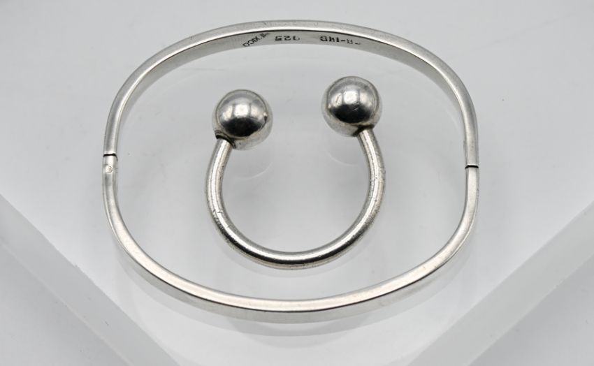 A small hinged cuff bangle, cushion shape in silver, stamped 925, 16.3g together with a torque style silver key ring stamped 925 Tiffany & Co approx 6g