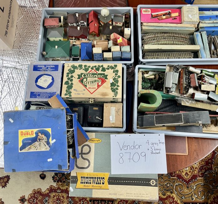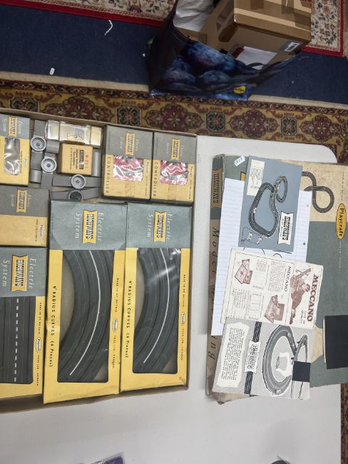 Hornby Dublo Model Railway plus Playcraft Electric Highways Model Motoring Set No. 2. Many parts in original boxes. All items have ben used and condition varies. Includes January 1951 original Meccano Listing of available products. Inc 'Power Control Unit