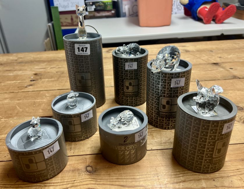 Swarovski Crystal Glass, a collection to include Rhino, Small Cat, Elephant, Hippo, Tall Cat (base reglued) etc, all boxed.