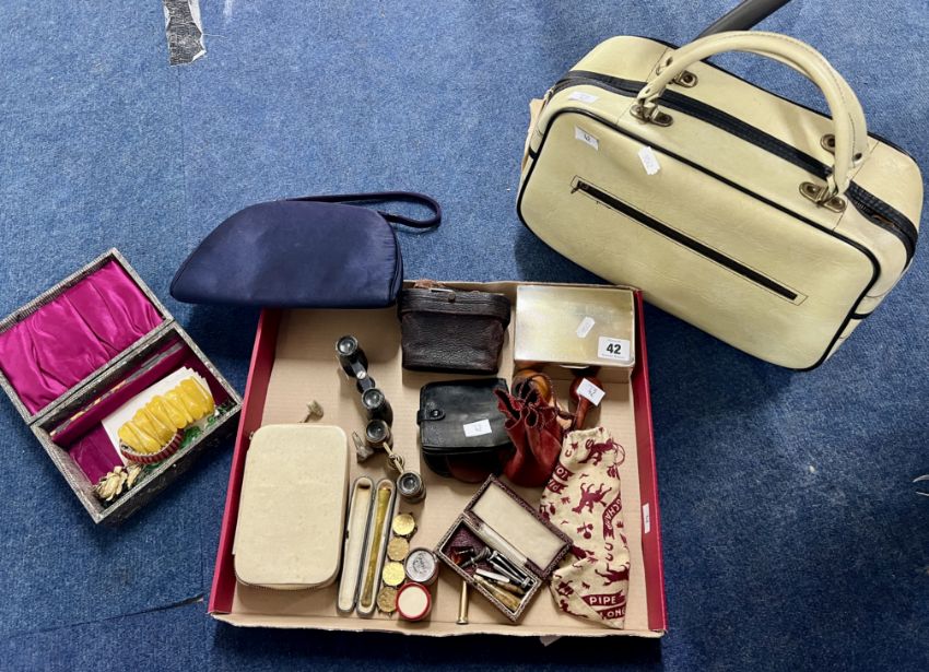 A mixed lot containing opera glasses, threepenny bracelet, gold mounted cigarette holder, pipes, Indian coins, vintage Collentz evening bag, bracelet, bead necklace, cigarette box, various items.