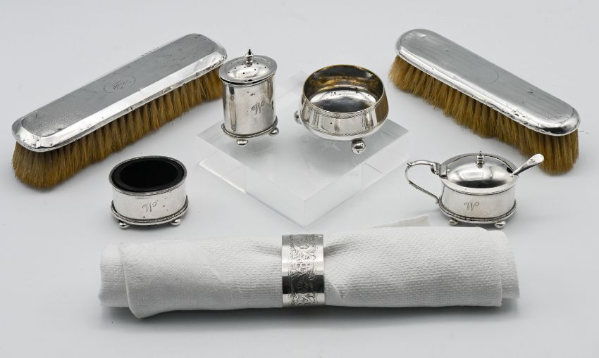 A silver napkin ring, a 3 piece George V silver condiment set and mustard spoon (silver weight approx 4.39oz), sliver plated table salt, pair of silver back brushes. Together with a linen table cloth, note the silverwares have the monogram of 'W' for the Washington family, (see lots 8 and 9 ).The table cloth with a crest showing the United States Washington family coat of arms, 84cm x 45cm.